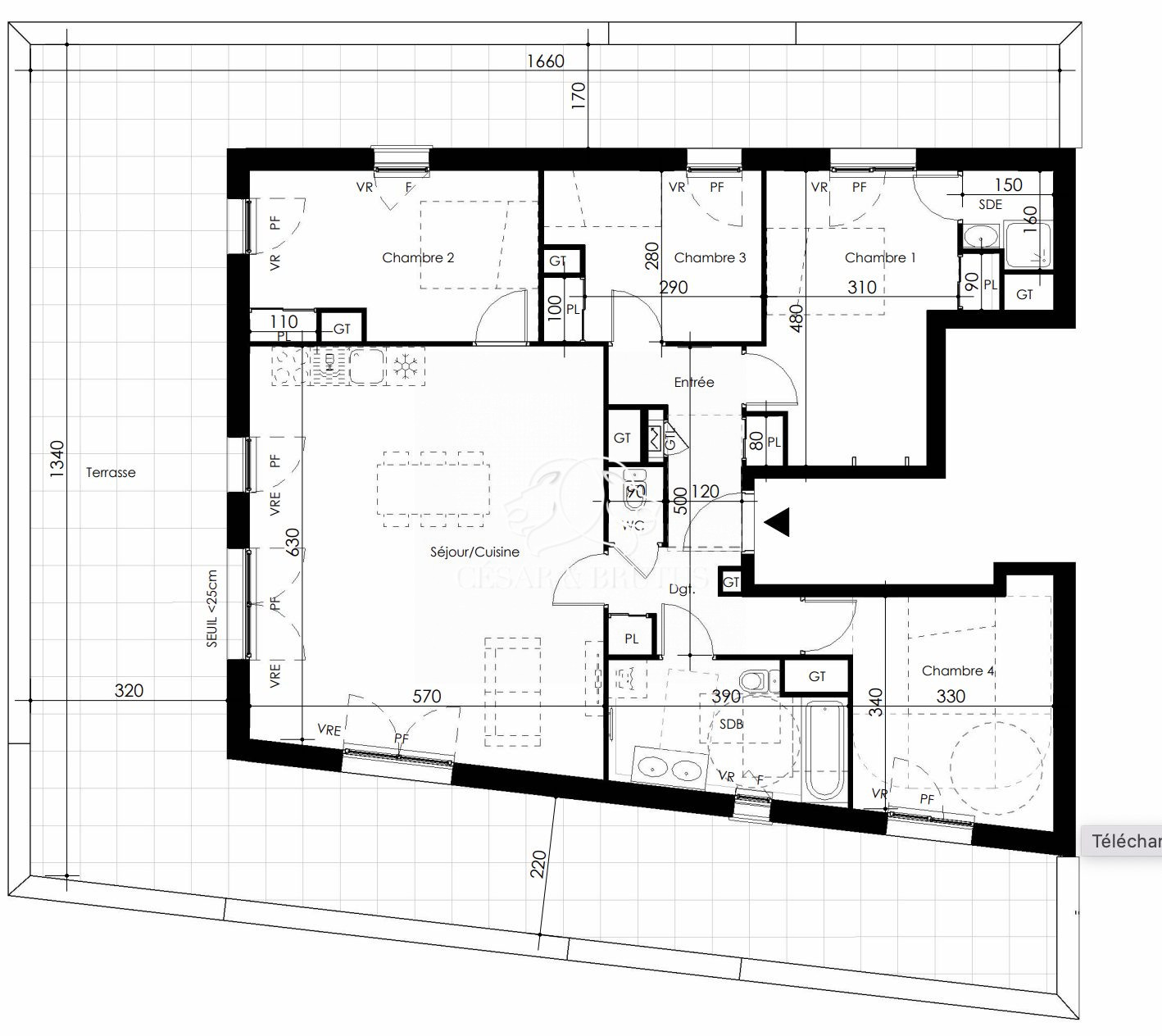 Surface généreuse et fonctionnelle : un grand séjour lumineux prolongé par une cuisine conviviale.