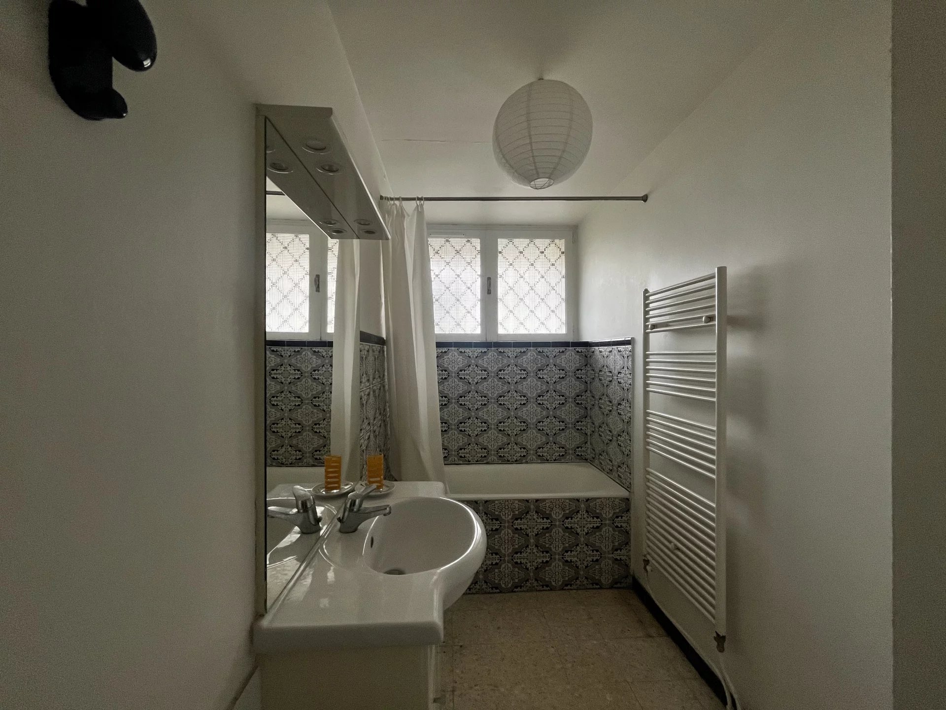 La salle de bain est spacieuse, les WC sont séparés, et l’appartement dispose de nombreux rangements.