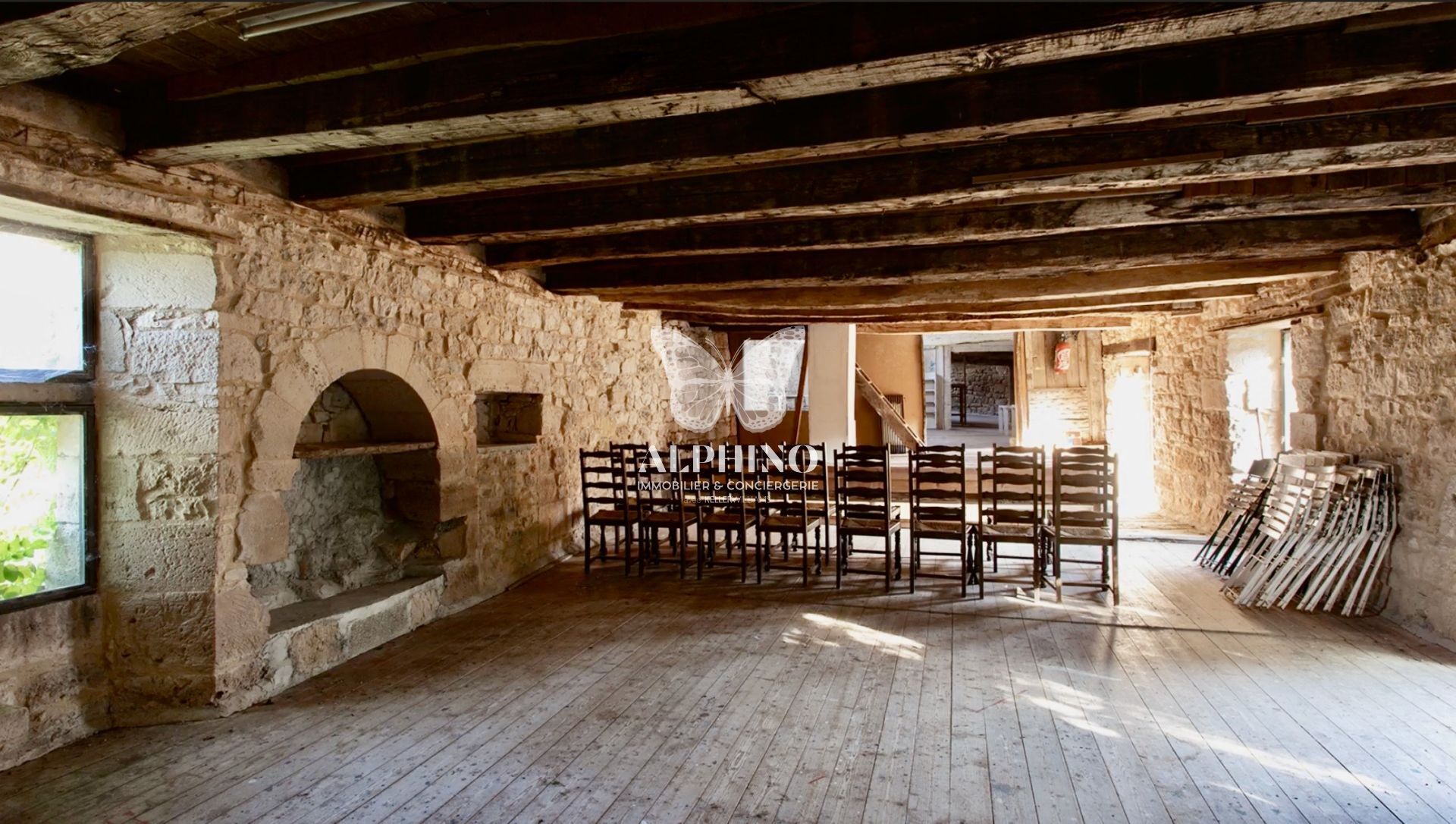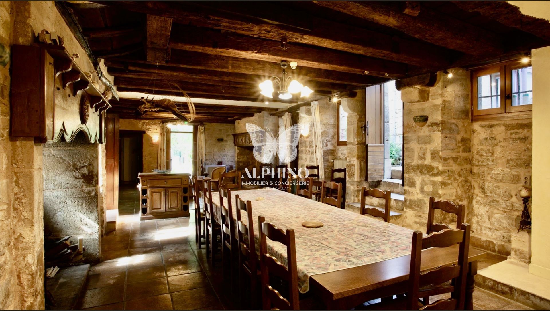 Une grande salle à manger en pierres apparentes, où trônent deux grands foyers ouverts fonctionnels, compose la troisième aile. Celle-ci est reliée à la cuisine parfaitement équipée.