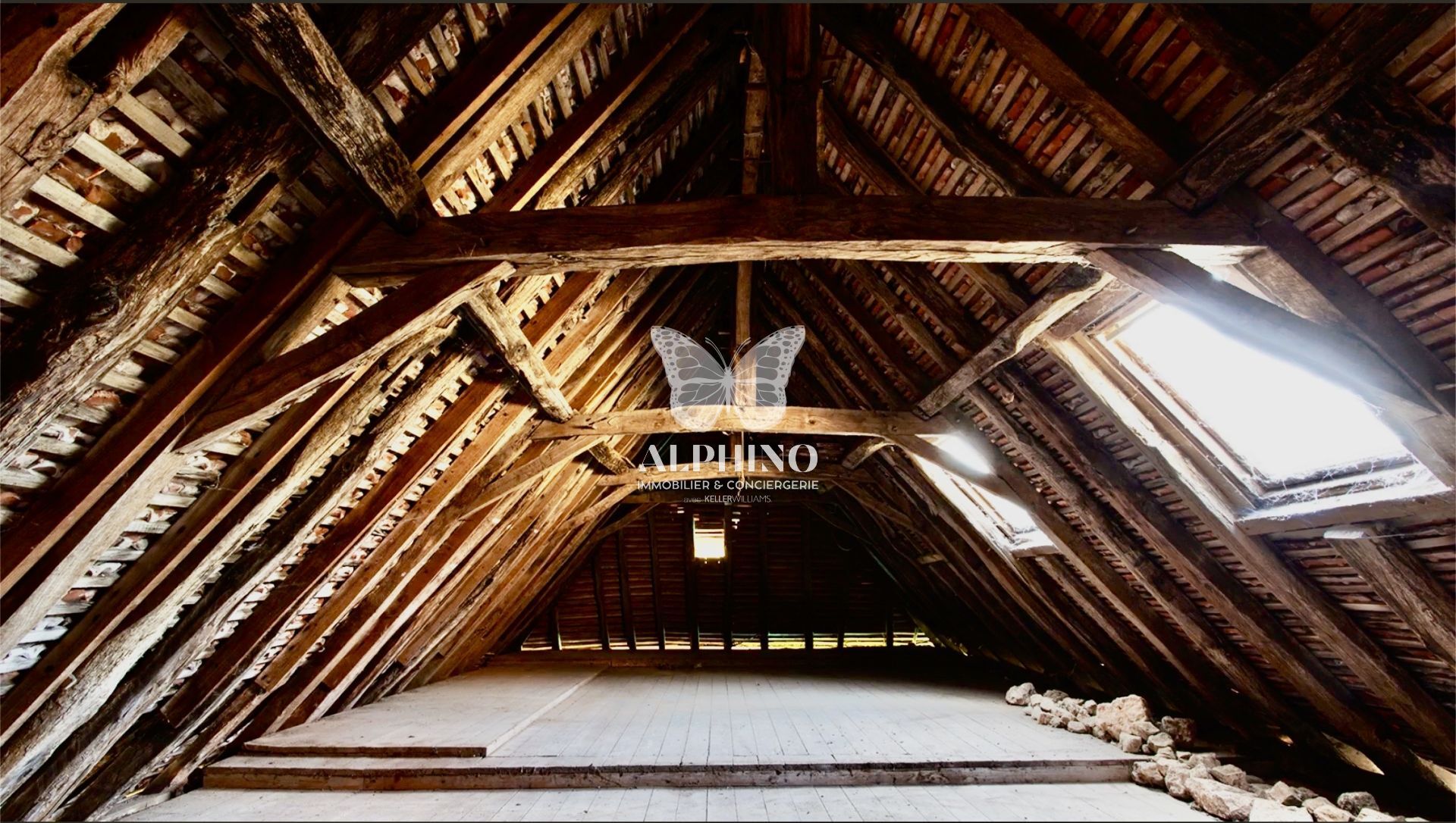 Au second étage, un appartement confortable mansardé, agrémenté de belles charpentes, dispose d'une cuisine ouverte, sanitaire et douche.