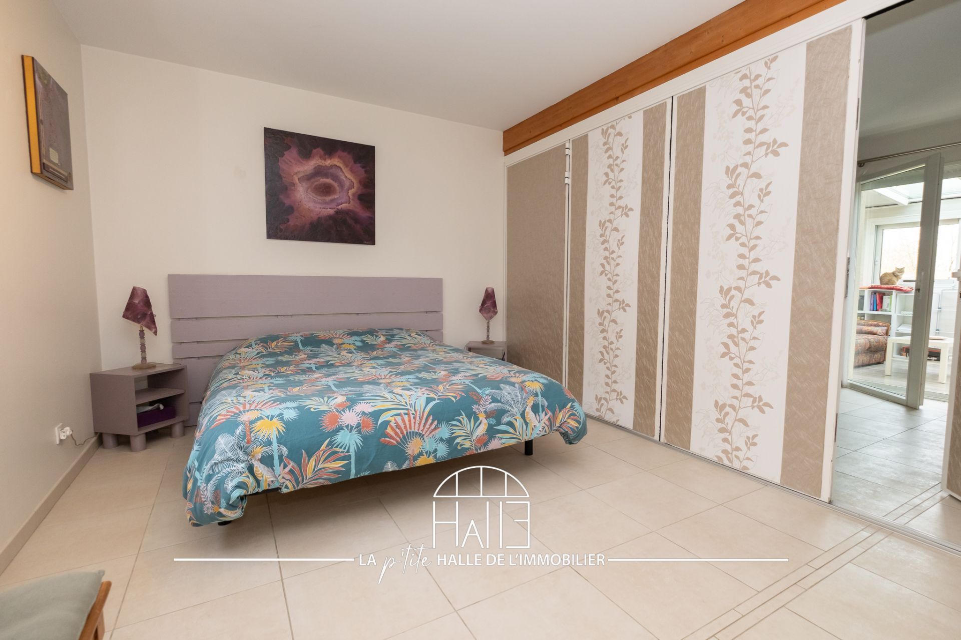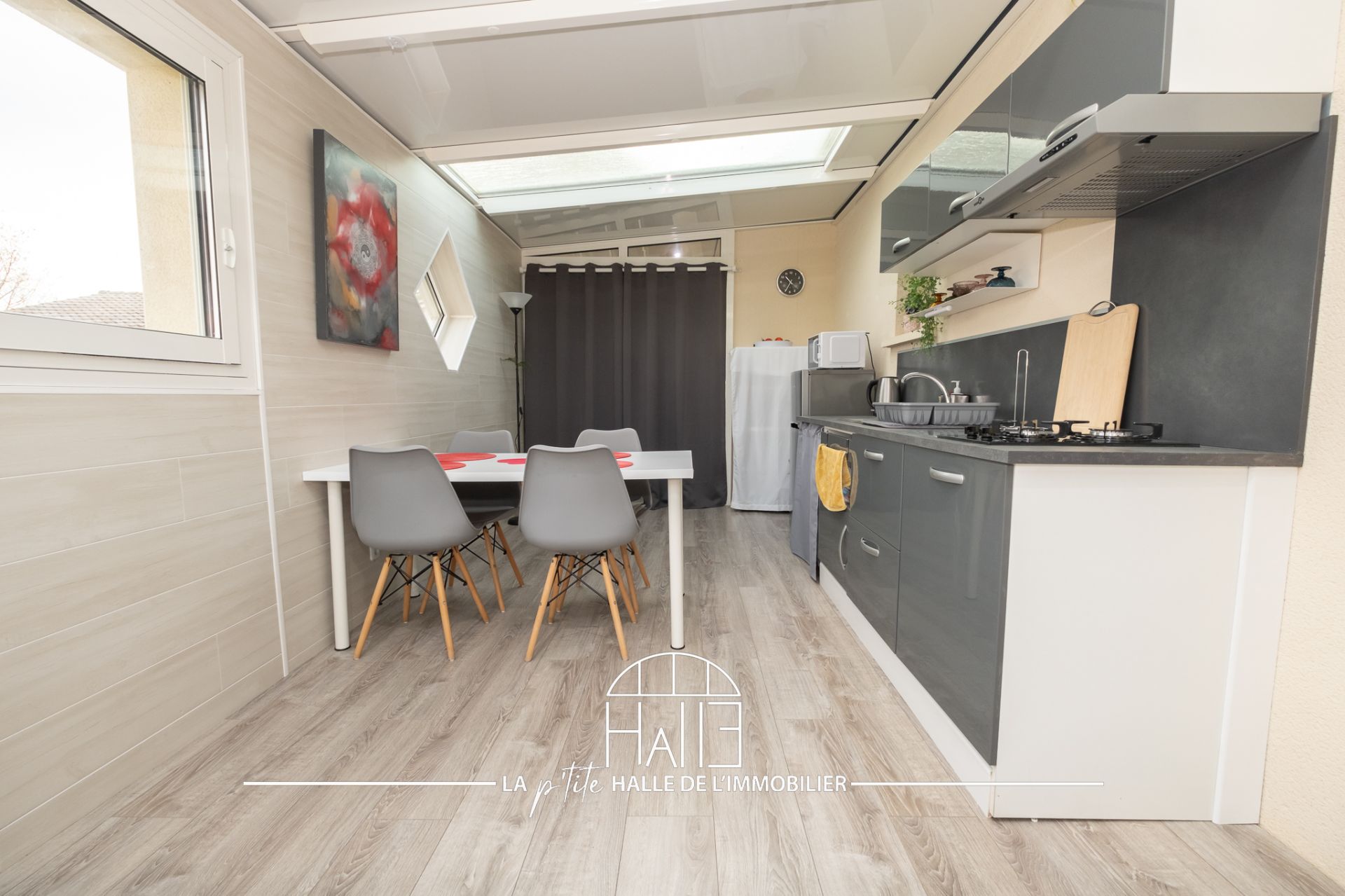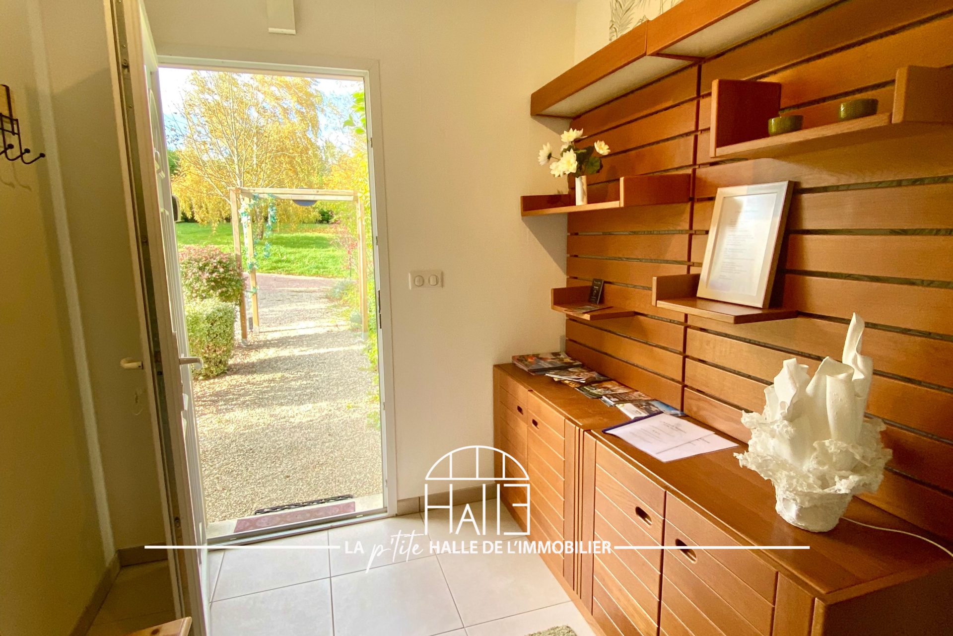 L’espace de vie s’ouvre sur une entrée élégante, un salon avec cheminée, une cuisine contemporaine entièrement équipée et une véranda baignée de lumière offrant une vue panoramique sur le parc. Une mezzanine domine cet ensemble et peut devenir un espace de travail, un atelier ou un salon additionnel. On trouve aussi un cellier, une lingerie et un WC.