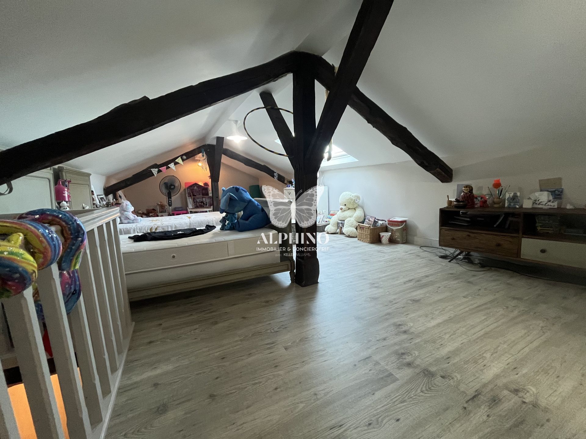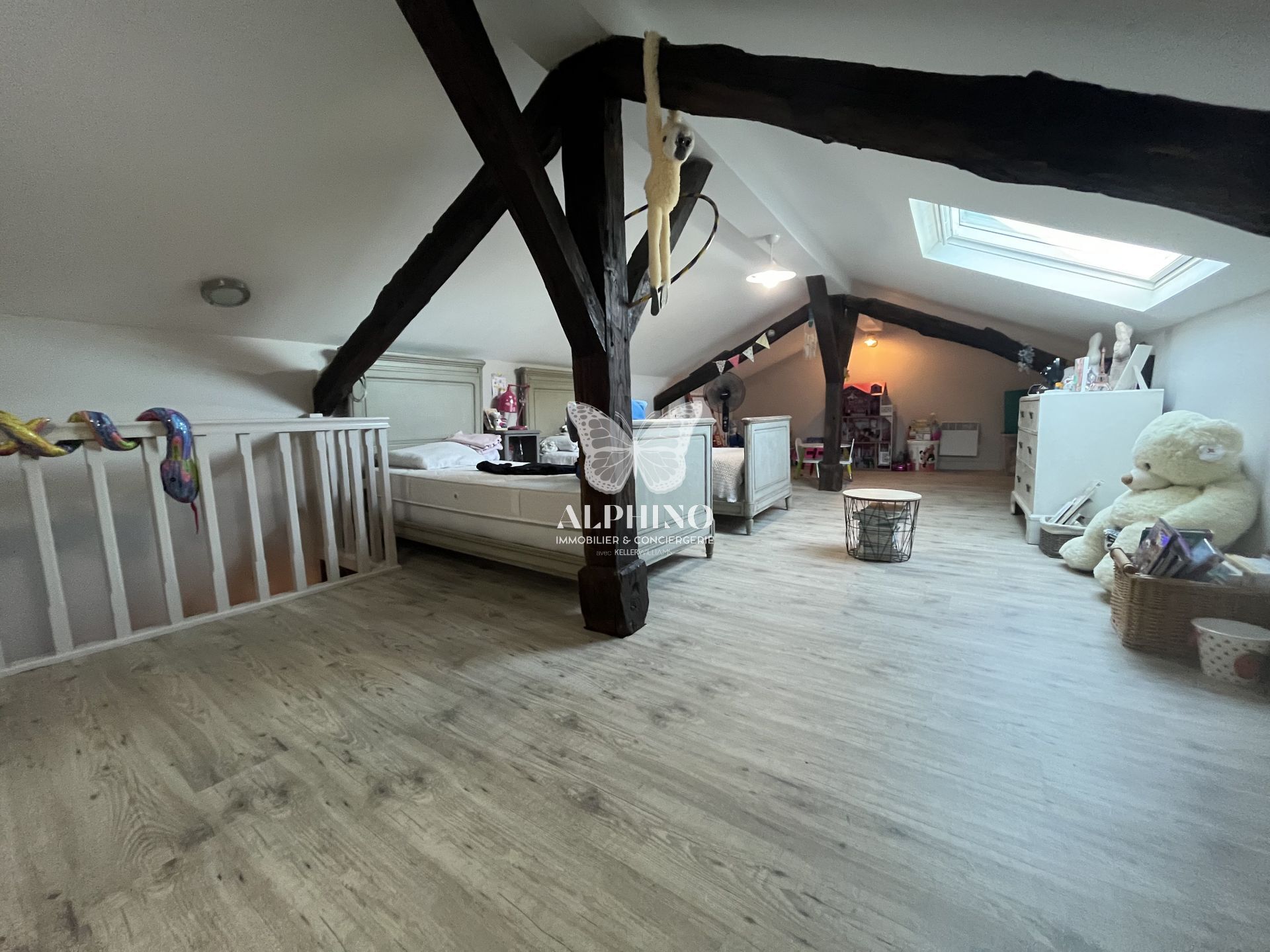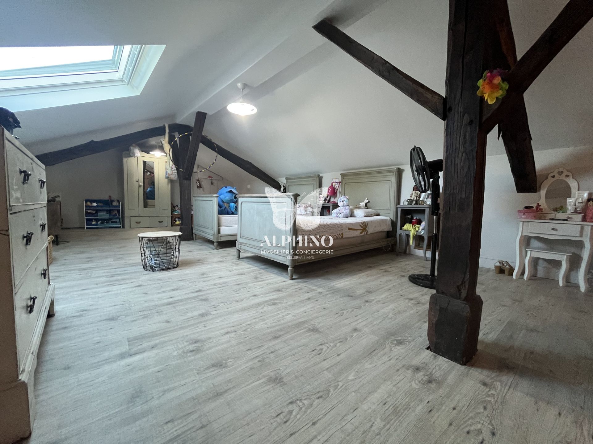 À l’étage, la maison propose deux chambres, ainsi qu’une grande pièce supplémentaire offrant de belles possibilités d’aménagement, notamment pour la création d’une suite parentale, d’un bureau ou d’un espace détente.