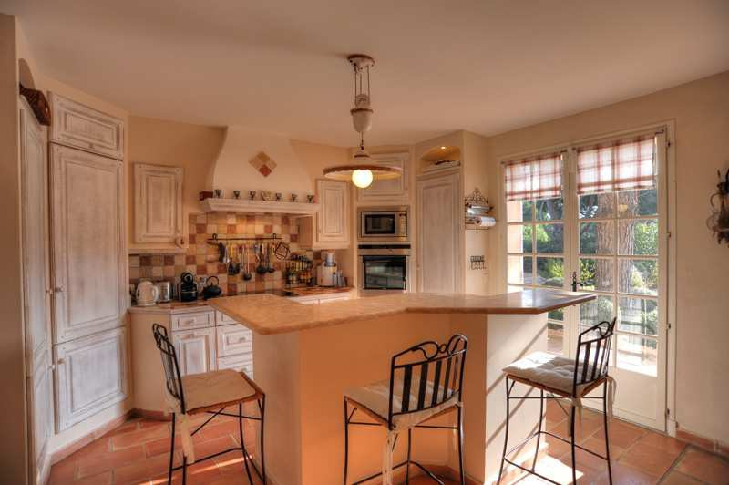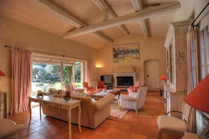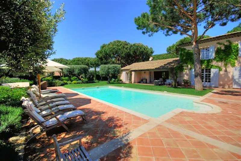 Cette élégante villa de charme de 5 chambres sur un grand terrain impeccablement maintenu et entièrement clôturé se situe à proximité à pieds de la plage de Tahiti. Les intérieurs sont joliment décorés dans un style provençal moderne et comprennent une grande entrée, un élégant salon avec cheminée, écran plasma et des baies coulissantes ouvrant sur la terrasse. Une salle à manger est adjacente ainsi quÂÂ?une cuisine entièrement équipée avec un ilot central et un bar pour les petit-déjeuners. Une chambre double avec salle de bains ensuite et la suite de maître sont situées au niveau principal, et deux chambres spacieuses partageant une salle de bains familiale sont situées au niveau supérieur. Pour une utilisation par des enfants ou du personnel, on accède indépendamment par la terrasse à une cinquième chambre avec une douche moderne et une mezzanine aménagée en dortoir avec quatre lits simples ; villa entièrement climatisée ; La piscine 6x12 (chauffée sur demande) est entourée de spacieuses terrasses aménagées de bains de soleil et de confortables fauteuils et canapés. Sur le côté de la piscine une terrasse couverte comprend une cuisine d'été avec barbecue à gaz, une salle à manger d'été et un salon d'été avec des canapés. Parking pour 4 voitures, demi-court de tennis idéal pour jeux de balle, piste de boules et grand trampoline.