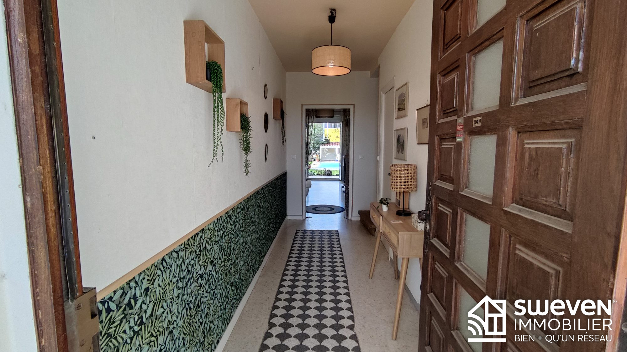 Elle se compose, au rez de chaussée, d'une entrée, dégagement, deux chambres, salon musique donnant sur une terrasse, le parc et la piscine, une salle d'eau, WC indépendant, une buanderie (aménagée pouvant devenir une cuisine) et un garage avec accès intérieur.