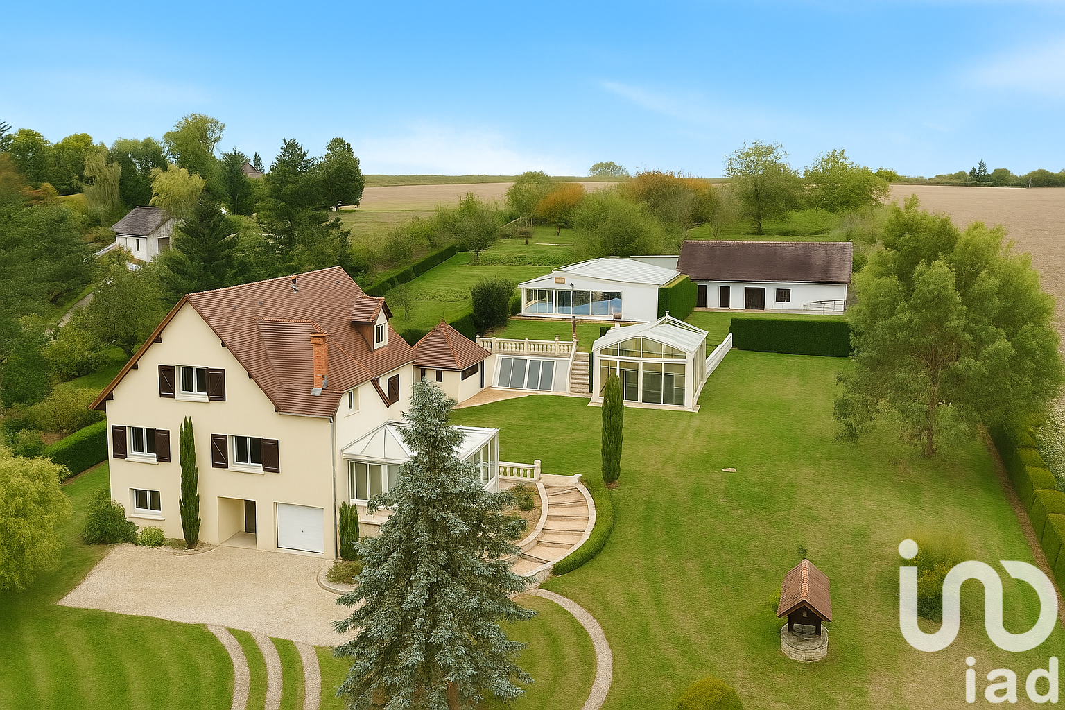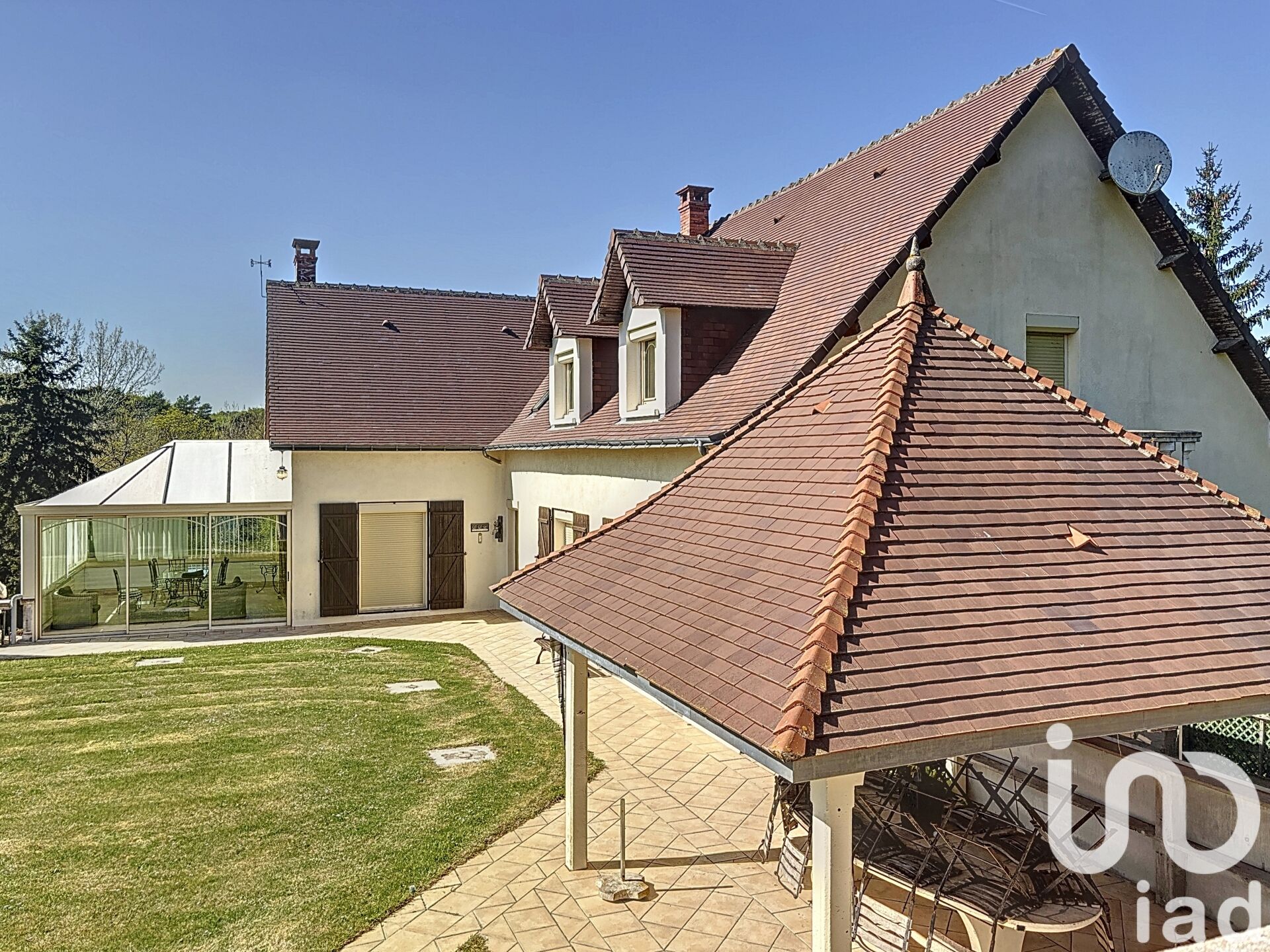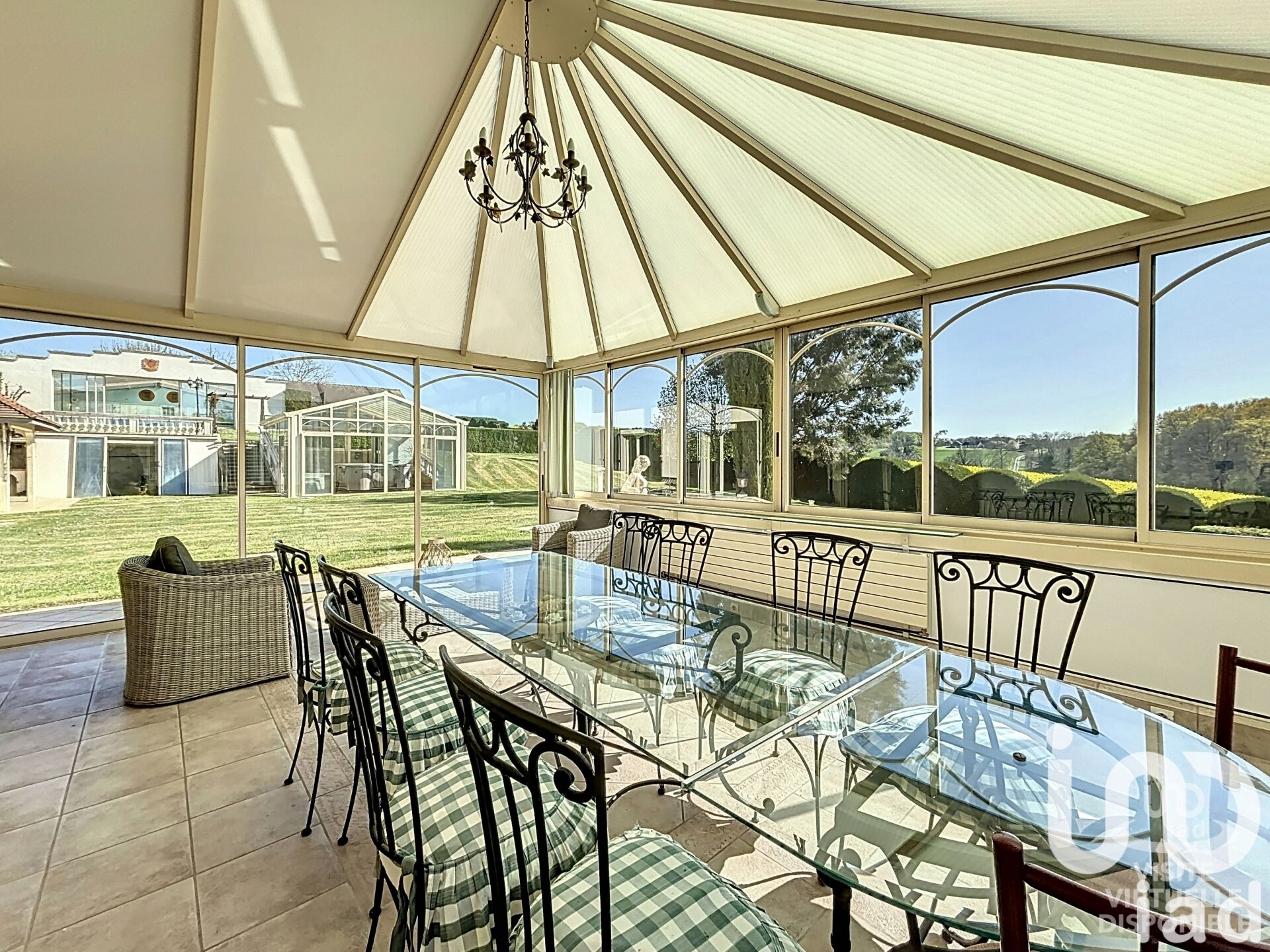 Le vaste hall d'entrée, sublimé par une belle hauteur sous plafond, vous mènera vers un salon séjour de 42 m² doté d'un parquet en chêne à chevrons, de moulures raffinées et de cheminées en marbre. Cet espace s'ouvre sur une véranda carrelée de tomettes, baignée de lumière naturelle, offrant un cadre de vie chaleureux et lumineux.
