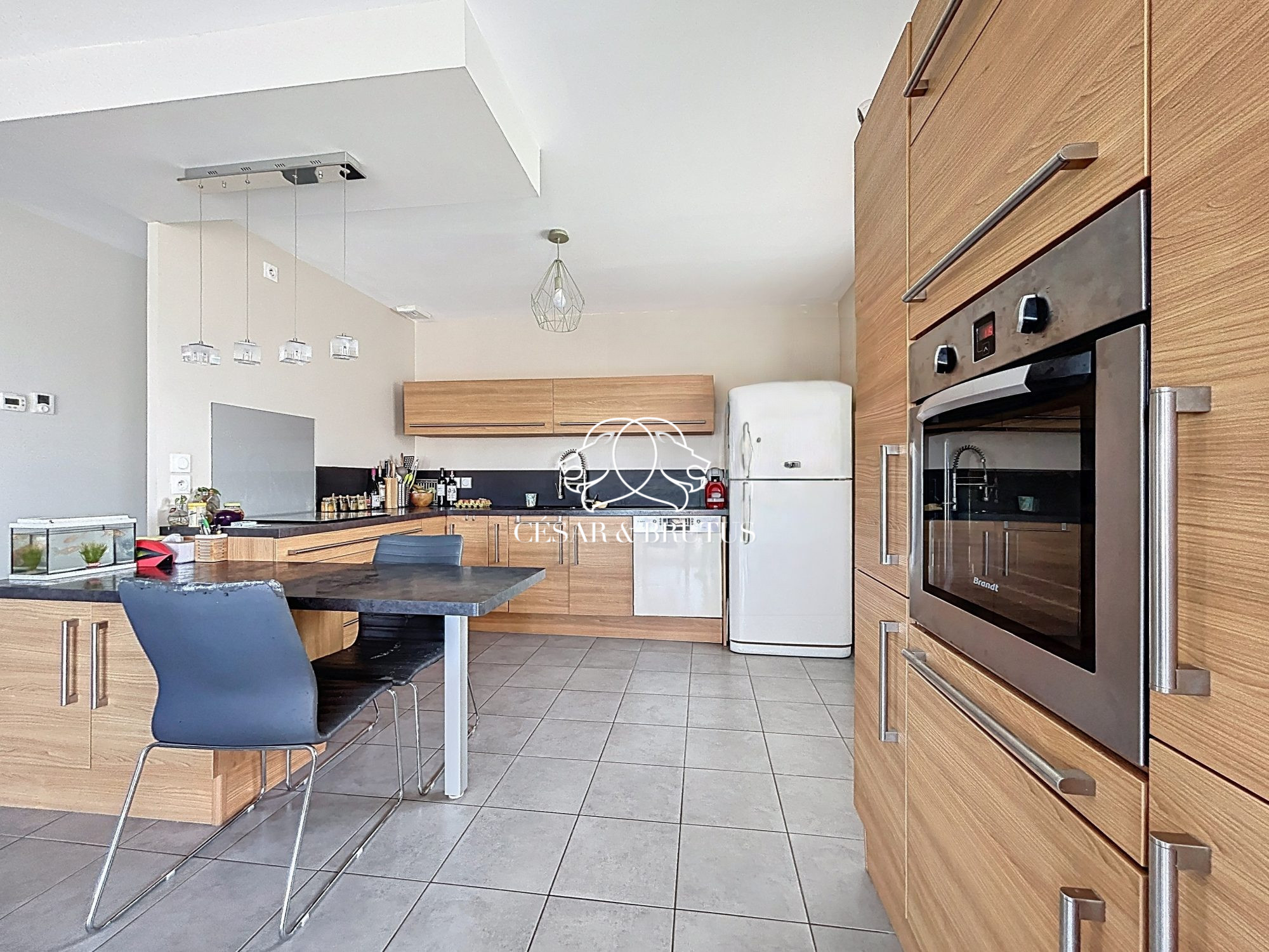 La maison s'ouvre sur une agréable pièce de vie lumineuse d'environ 32 m², avec cuisine américaine aménagée et équipée ouverte sur le séjour, créant un espace convivial et chaleureux pour les moments en famille ou entre amis. Grâce à son exposition traversante et sa vue dégagée, la maison bénéficie d'une belle luminosité tout au long de la journée.