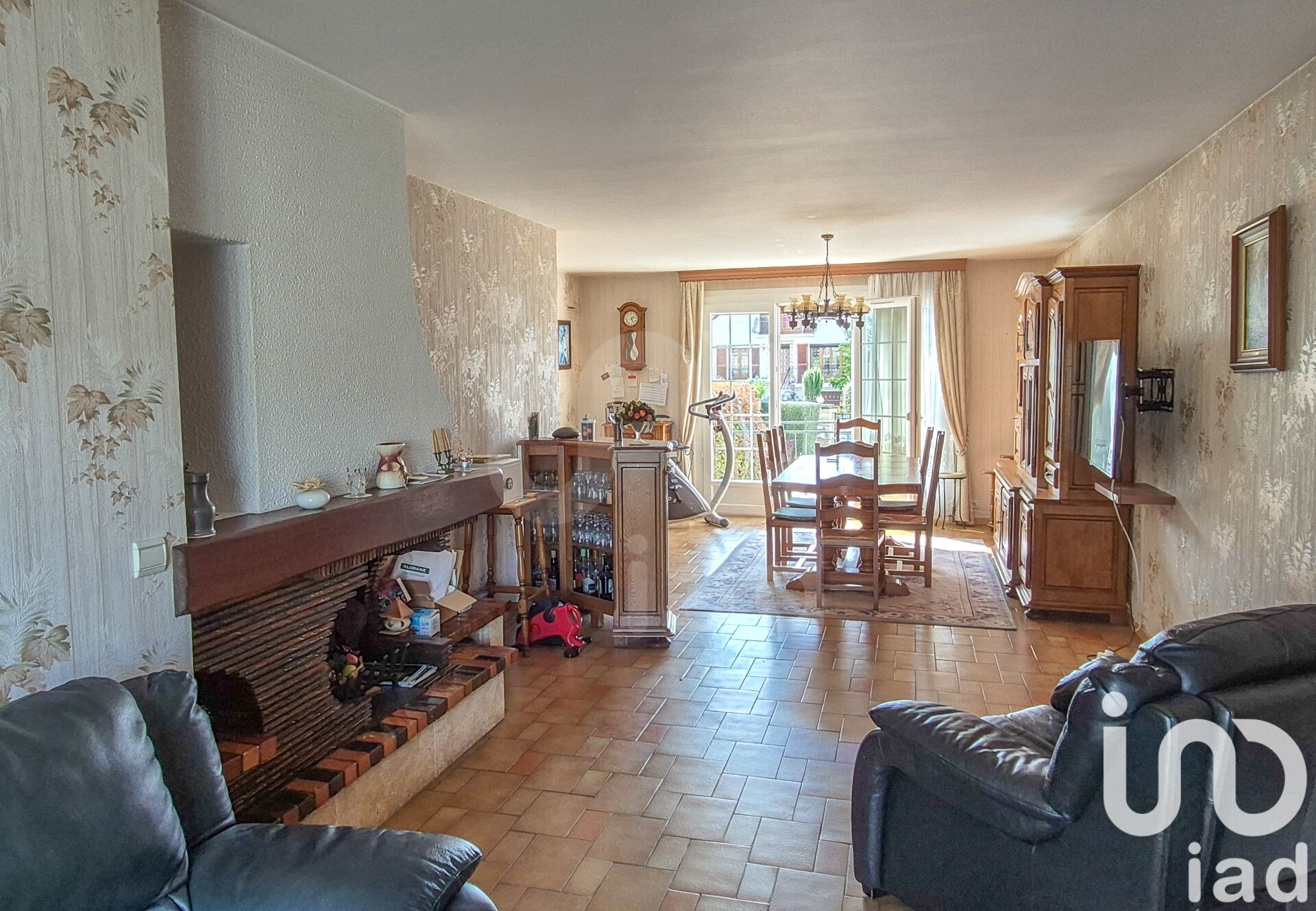 En rez-de-jardin, salon avec cheminée et portes-fenêtres sur terrasse et jardin orientés sud-ouest, cuisine semi-ouverte aménagée équipée, pièce de rangement et WC, garage avec accès jardin. A l'étage, 3 chambres dont 1 avec placards, salle de bain avec WC, placard dans couloir.