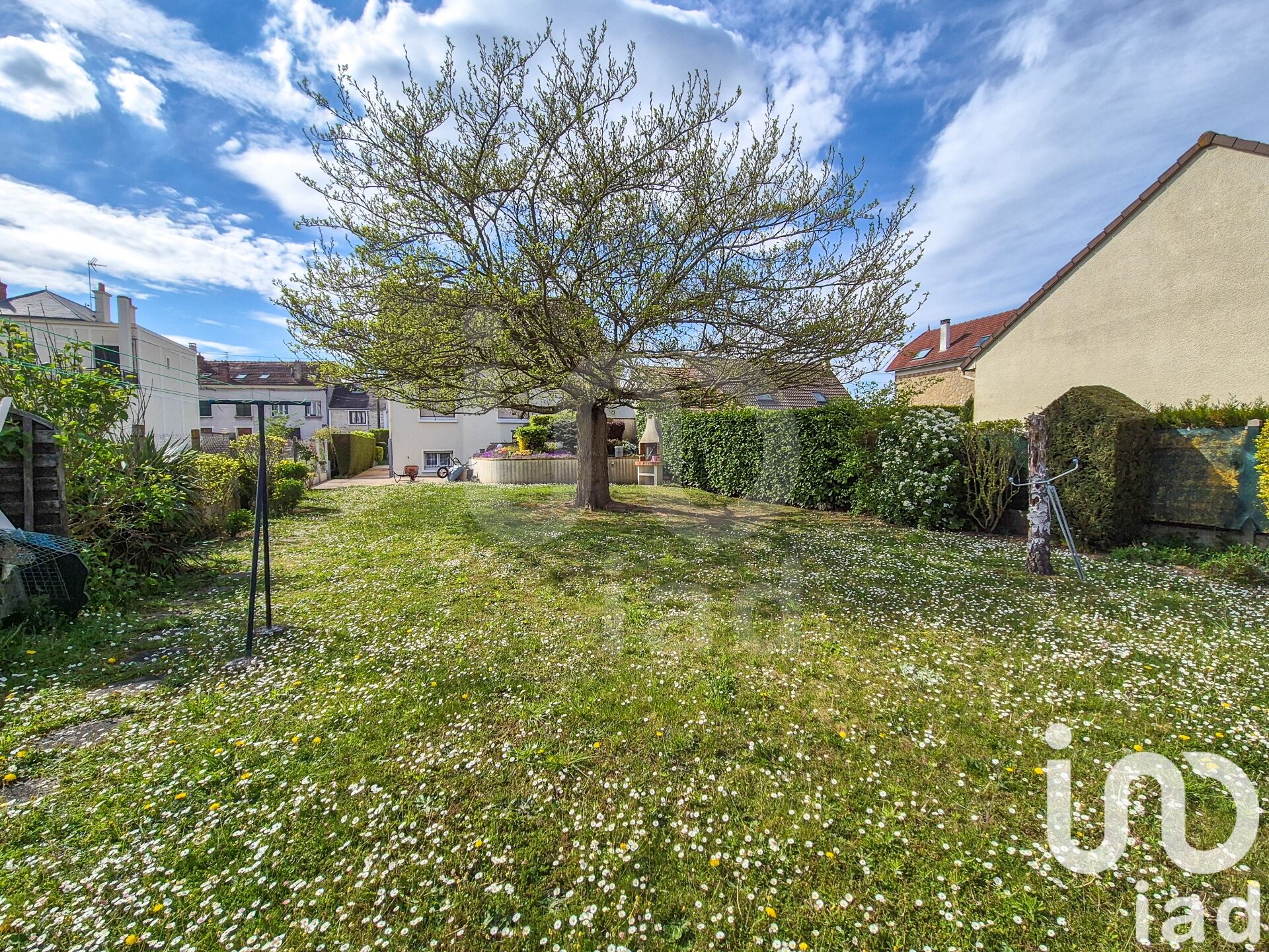 Garage, terrasse et jardin avec arbres fruitiers.
