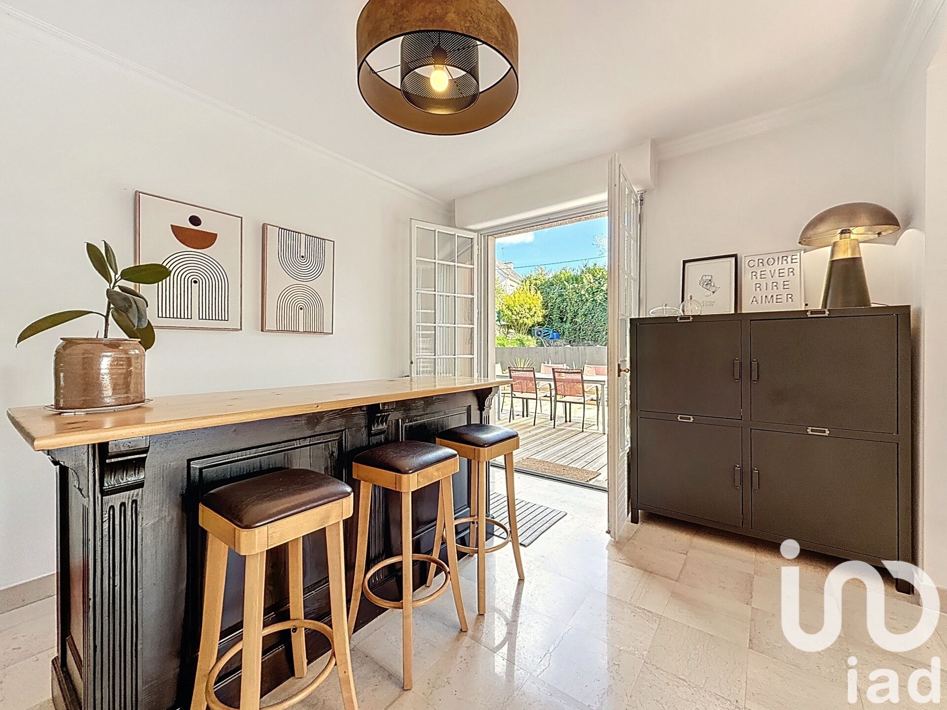 Iad France - Marina Le Ruyet vous propose : Hennebont – Quartier prisé des Haras - Maison Néo-Bretonne rénovée avec soin et matériaux de qualité, dans un état impeccable. En rez-de-rue : grand garage de près de 50 m², buanderie et cave. Au rez-de-jardin : vaste pièce de vie lumineuse avec cheminée et insert, ouvrant sur terrasse et jardin, cuisine séparée récente, chambre, salle d’eau, dressing et WC. À l’étage : quatre chambres, un bureau, une salle d’eau, un WC et des combles aménageables. Jardin bien exposé avec petite piscine, parfait pour les beaux jours ! Mon avis : Le charme Néo-Breton où volumes, lumière et élégance se côtoient ! Un environnement prisé à deux pas des commodités et des rives du Blavet. Cette annonce correspond à votre recherche ? Contactons-nous par téléphone. Agences et mandataires : inter-cabinet bienvenu ! Honoraires d'agence à la charge de l'acquéreur. Prix honoraires inclus : 434900 euros. Prix hors honoraires : 420000 euros. Honoraires TTC à la charge de l'acquéreur (3,55% du prix du bien hors honoraires) : 14900 euros. Information d'affichage énergétique sur ce bien : classe ENERGIE D indice 178 et classe CLIMAT D indice 37. Les informations sur les risques auxquels ce bien est exposé, y compris l'obligation légale de débroussaillement, sont disponibles sur le site Géorisques : http://www.georisques.gouv.fr. La présente annonce immobilière a été rédigée sous la responsabilité éditoriale de Mme Marina Le Ruyet mandataire indépendant en immobilier (sans détention de fonds), agent commercial de la SAS I@D France immatriculé au RSAC de LORIENT sous le numéro 829554161, titulaire de la carte de démarchage immobilier pour le compte de la société I@D France SAS.