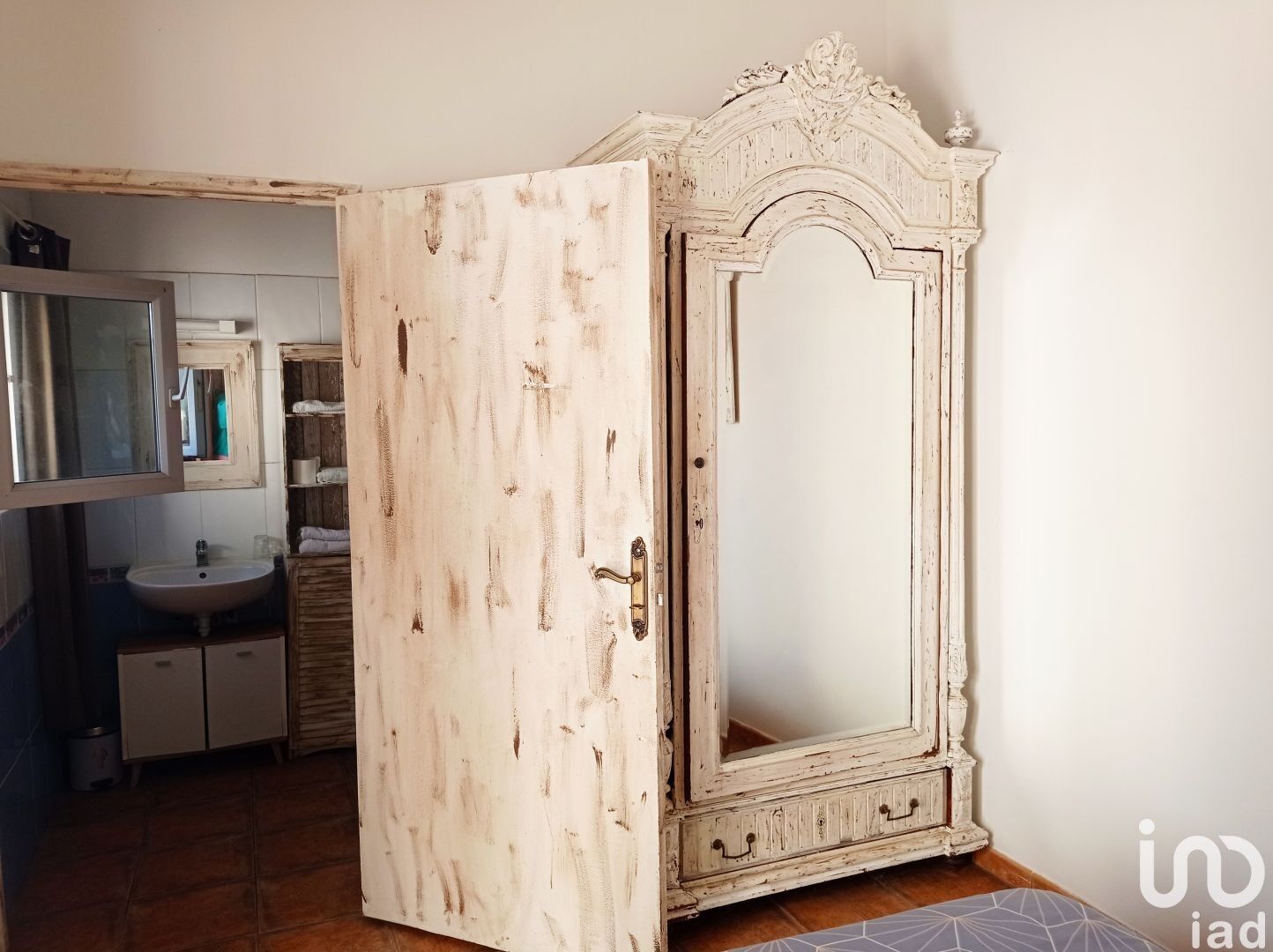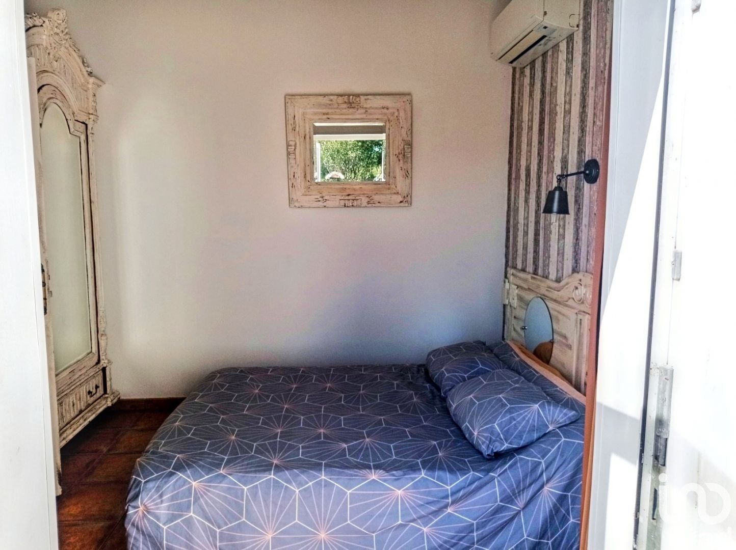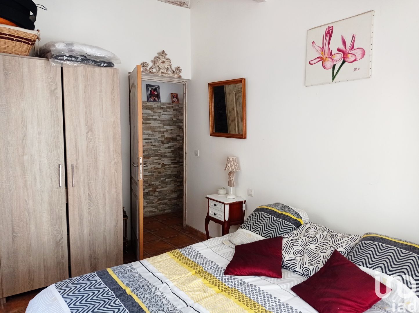 A l'étage : une chambre avec salle de bains et WC.